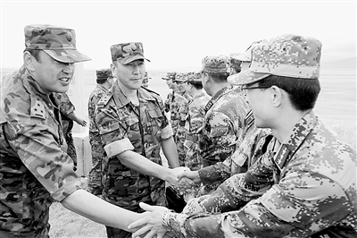 2003年以来,中国新疆塔城边防机关与哈方边防机关不断加强交流合作,开启了“肩并肩”联合边境管控行动,探索总结出联合踏边、联合巡逻、联合搜索等十余种行动方式,确保了共管边境地段的安全稳定。图为两国边防军人握手道别的情景。