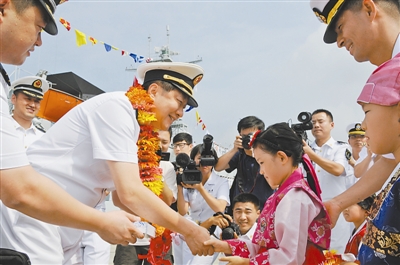 8月4日,在郑和舰抵达韩国镇海港后,韩国儿童向出访指挥员、海军大连舰艇学院院长姜国平献上花环。当日,郑和舰抵达韩国镇海港,开始对韩国为期4天的友好访问。这是郑和舰第二次访问韩国镇海。新华社发?